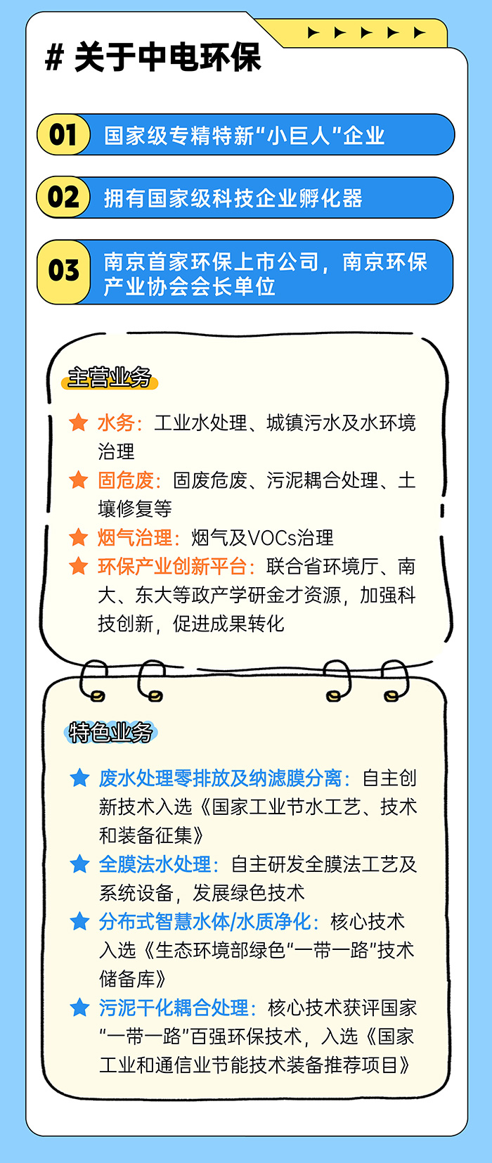 中電環(huán)保股份有限公司是南京市首家環(huán)保上市公司(股票簡(jiǎn)稱(chēng):中電環(huán)保,股票代碼:300172),南京環(huán)保產(chǎn)業(yè)協(xié)會(huì )會(huì )長(cháng)單位,國家級聯(lián)盟理事長(cháng)單位,是生態(tài)環(huán)境治理服務(wù)商,主營(yíng)(3+1):水務(wù)、固危廢、煙氣治理及產(chǎn)業(yè)創(chuàng )新平臺,包括:工業(yè)水處理、污水處理及水環(huán)境綜合治理;固危廢土壤、污泥餐廚垃圾處理;煙氣及VOCS治理;智慧環(huán)保;高端裝備等。